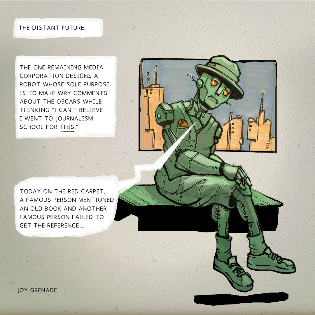 After all, those journalists I'm satirizing are me "in a different life." Hell, they're not so far from me in this life: I've also done work that comes very, very close to what they do. You have deadlines. You need to eat. Hunger makes you cruel. Cruelty invites more cruelty--and before you know it you're the subject of someone's mediocre cartoon, on display in some obscure corner of Reddit.